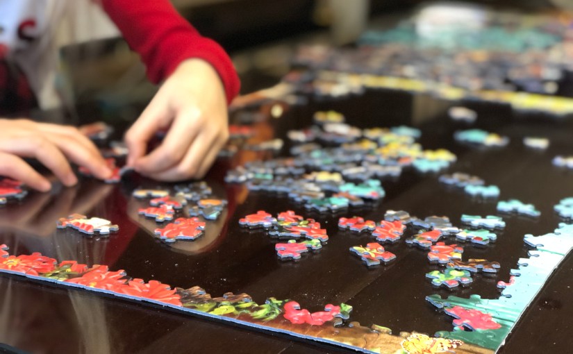 I grew up working on puzzles with my family during the winter holiday breaks. Every year between Christmas and New Years, every member of my family could be found hunched over a temporary card table set up in the middle of the living room. Never-mind Santa Claus; The main source of magic in those days was waking up to find a gigantic portion of the puzzle completed. Sometimes, feelings of gratitude flooded the soul, since a piece that had eluded me was found and locked in place. Other times, I would feel cheated, because a large portion of the puzzle was no longer available for construction.